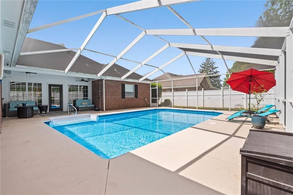 Let's start with the showstopper-an incredible outdoor setup featuring a triple garage and a sparkling in-ground pool with screened lanai. This space is made for relaxing or entertaining. Now step inside to a beautifully designed custom-built, one-level home situated on a level lot, combining convenience with thoughtful craftsmanship.The interior showcases hardwood floors, detailed molding, and a highly functional split-bedroom floor plan. With 4 bedrooms and 3 full baths, there's space for everyone. The primary suite is a true retreat, featuring dual closets and vanities, a large walk-in shower, and a jetted tub. A private guest suite is tucked away on the opposite side of the home with its own full bath, while two additional bedrooms share the hall bath.The kitchen is both spacious and inviting, complete with an eating area, stainless steel Energy Star appliances, white cabinetry, a center island, and abundant granite countertops. The family room offers gas log fireplace and flows seamlessly into a bright sunroom overlooking the pool and lanai, creating a perfect indoor-outdoor connection. A formal dining room adds flexibility and could easily serve as an office, playroom, or additional living space.This home has been meticulously maintained with numerous updates, including new lanai screening (2025), pool motor (2025) Pool pump=(2024) electric range (2024), pool liner (2018), roof (2017), HVAC system (2017), and water heater (2017). Move-in ready and thoughtfully updated, this property offers comfort, style, and exceptional livability. Fidelity Home Warranty to transfer, expires 10/23/2026. *** Listing Broker makes no representation to accuracy of square footage. Buyer to verify. Any/All updates per seller(s). ***