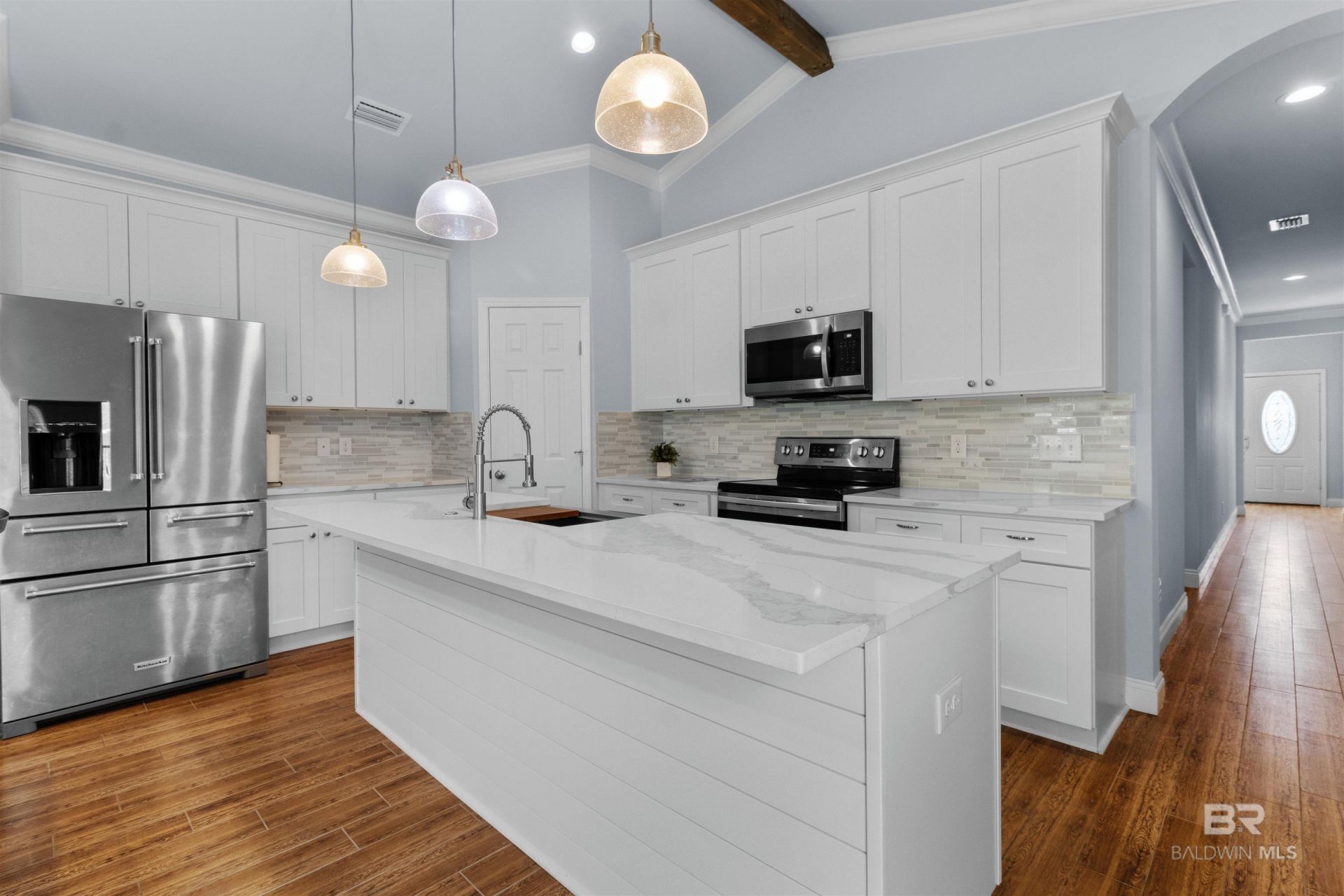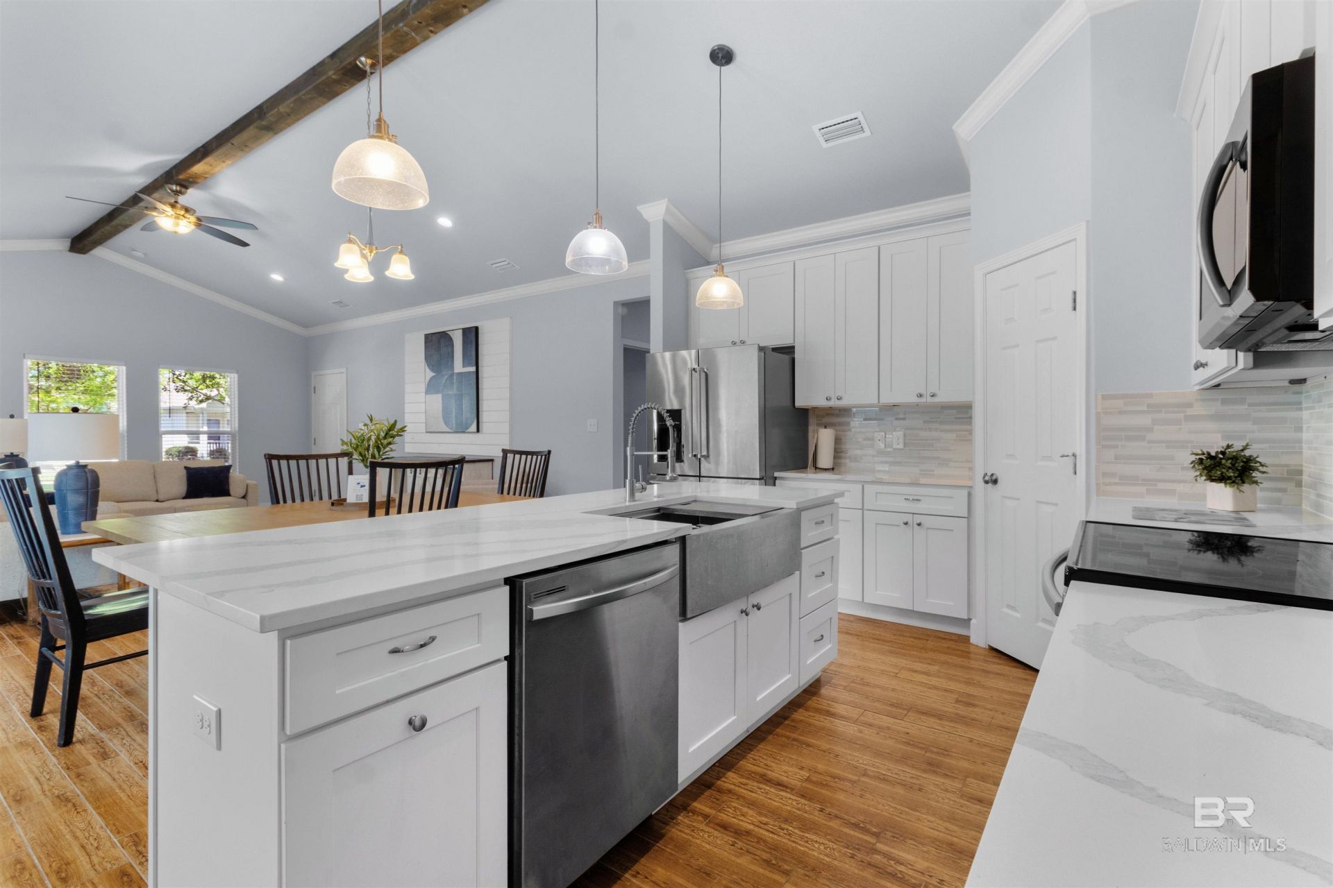 Built in 2020. Gold Fortified construction. And it sits on high ground outside the federal flood zone. If you're tired of worrying about your home insurance bill, start here.One-story cottage in the gated Cottages on the Greene. 3BR/2BA, 1,920 sq ft split floor plan primary suite on its own side of the house. Open-concept kitchen with a center island, walk-in pantry, and quartz countertops that carry through to the laundry room. Ceramic tile throughout. No carpet anywhere.Primary suite brings a walk-in closet, double vanity, and walk-in shower. Hardie plank fiber-cement siding. 2-car attached garage. Two covered porches tucked beneath the shade of a mature oak tree the kind of spot you'll actually want to sit. All appliances convey.Gated community with pool, clubhouse, and pet-friendly grounds. Low HOA. Minutes to OWA, Tanger Outlets, and Foley dining. Straight shot to Gulf Shores and Orange Beach. Flood Zone X.Move-in ready. Full-time, snowbird, or second home this one checks the boxes. Buyer to verify all information during due diligence.